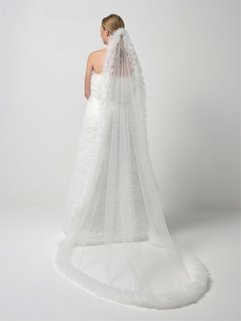 - Wenn Sie einen runden Schleier (ohne Kamm) mit Rüschen suchen, wählen Sie Schleier S415-200/R/SOFT aus der Trend Collection von Poirier. Dieser elfenbeinfarbener oder blushfarbener Schleier ist aus einlagigem Soft-Tüll und hat eine Verzierung aus elfenbeinfarbenen oder blushfarbenen Rüschen an den Rändern. Die Länge beträgt 200 cm. Kombinieren Sie diesen Schleier mit Ihrem Brautkleid.
