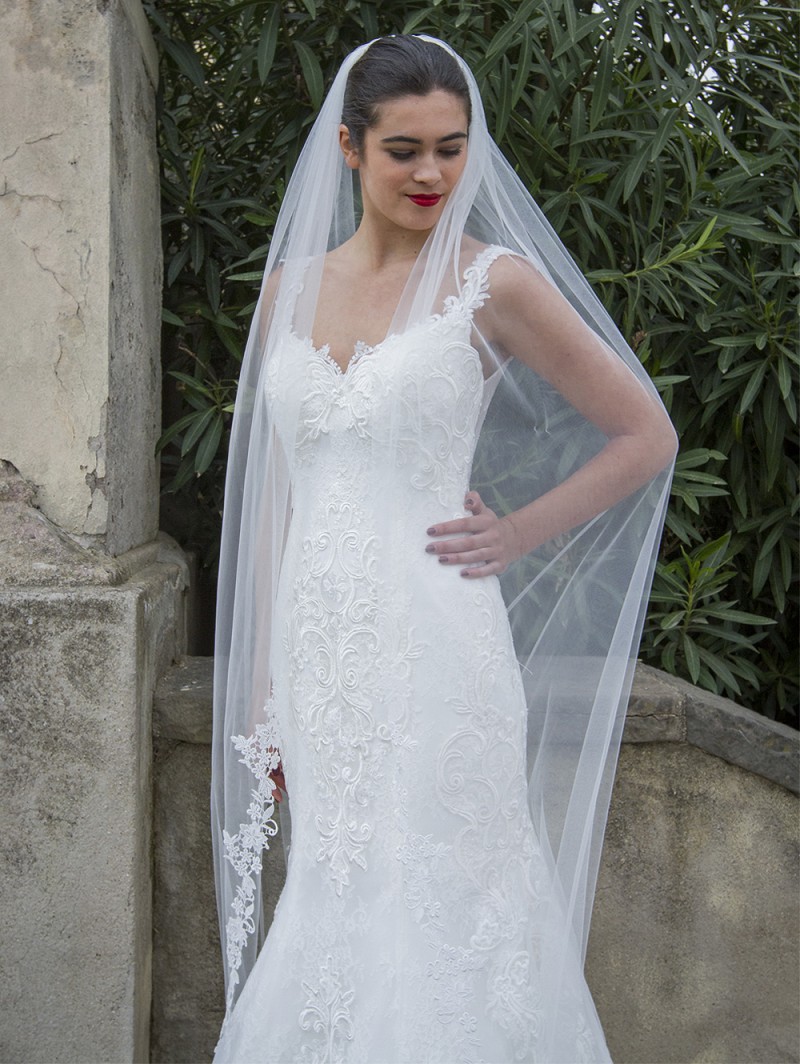 Schleier aus der Randy's Favourites Collection. Einlagiger Schleier aus Soft-Tüll mit einem luxuriösen Blumenmuster aus bestickter Spitze. Länge 280 cm.