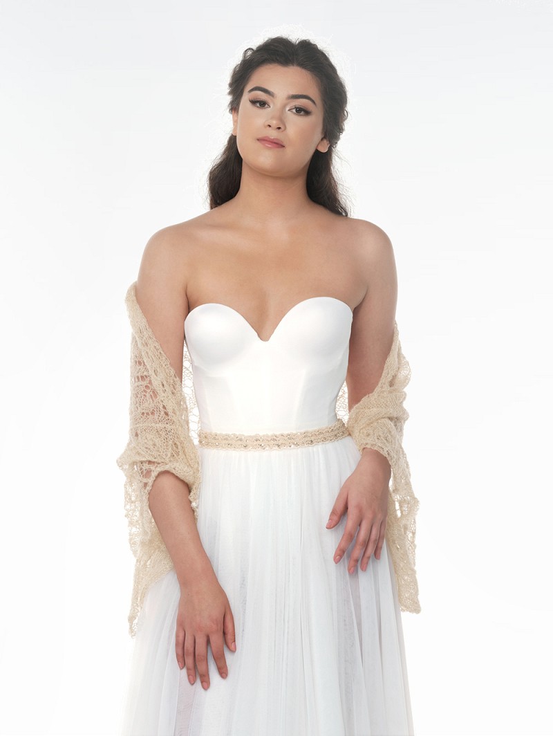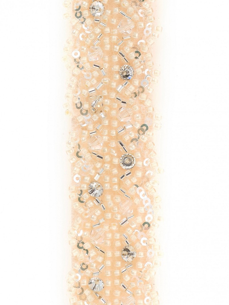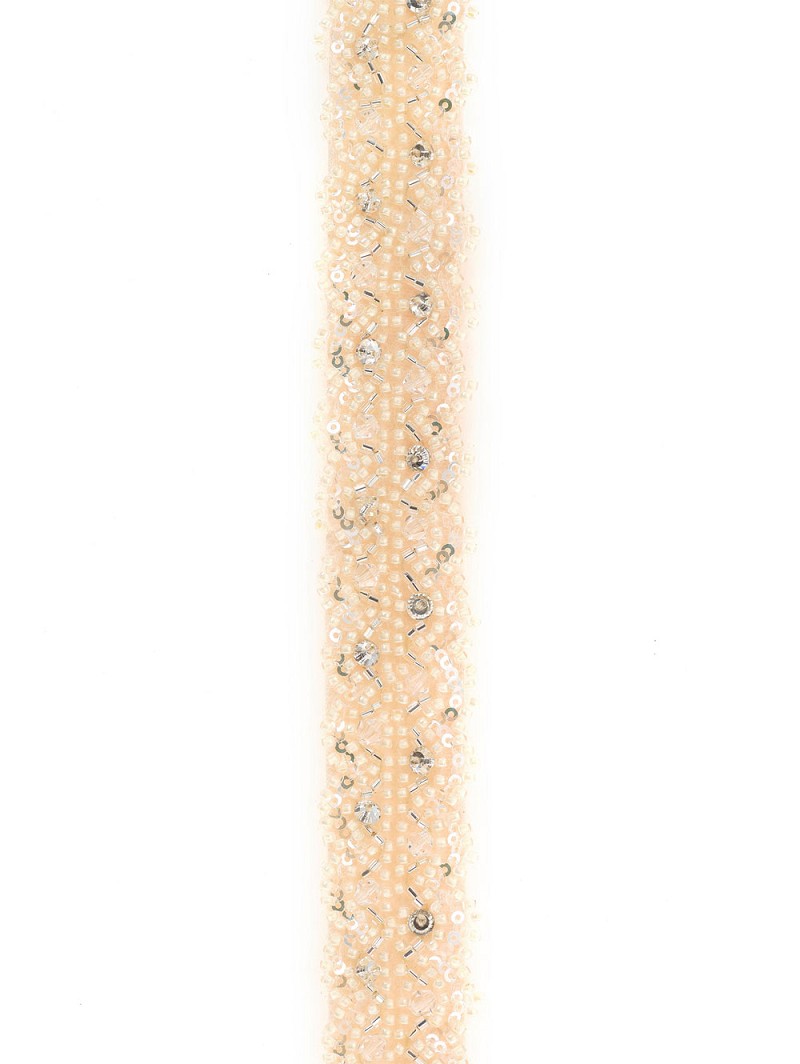 - Ivory-colored and peach-colored belt with an application with rhinestones, crystals, and sequins