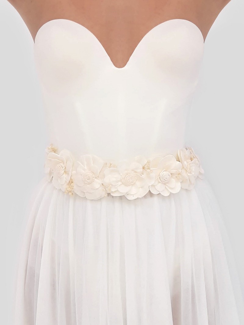 - When you are looking for the ultimate festival-themed belt, have a look at belt C-1335. This belt has an ivory-coloured, lace base, and a decoration of big ivory-coloured flowers, and real ivory-coloured gypsophila. This belt has the ultimate festival look, and fits a great many festival-themed bridalwear.