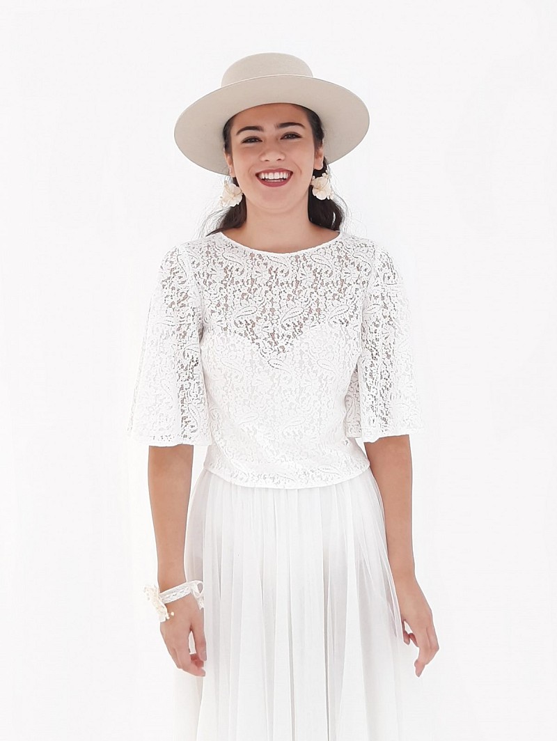 - The Blouse T-130 of the Festival Collection of Poirier can be worn as a very special bridal top. This blouse has bell sleeves up to the elbows and a zipper mid-back. Combine this ivory-coloured blouse that is made out of delicate, French lace with an overskirt or bustier of Poirier for a dazzling wedding outfit. This blouse is available in 4 sizes (S, M, L, XL).