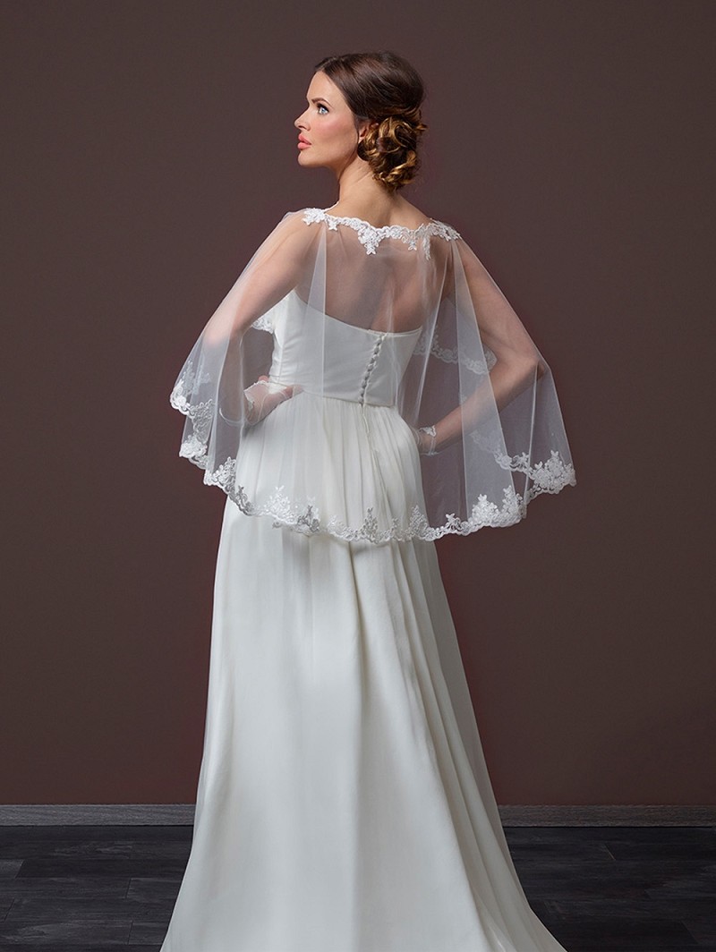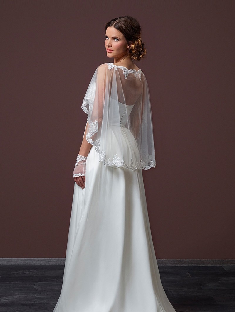 Capa de tul suave y delicado encaje, perlitas y lentejuelas. Longitud por delante 30 cm, espalda 60 cm. Disponemos de un velo (modelo S50) con este mismo encaje.