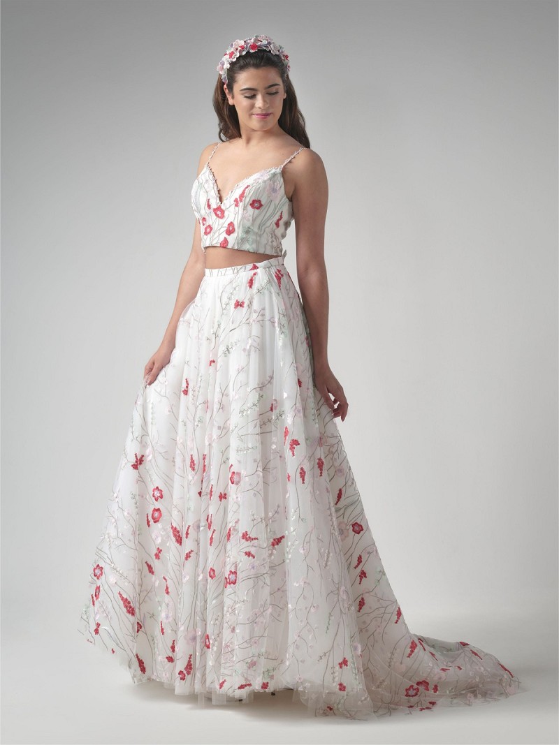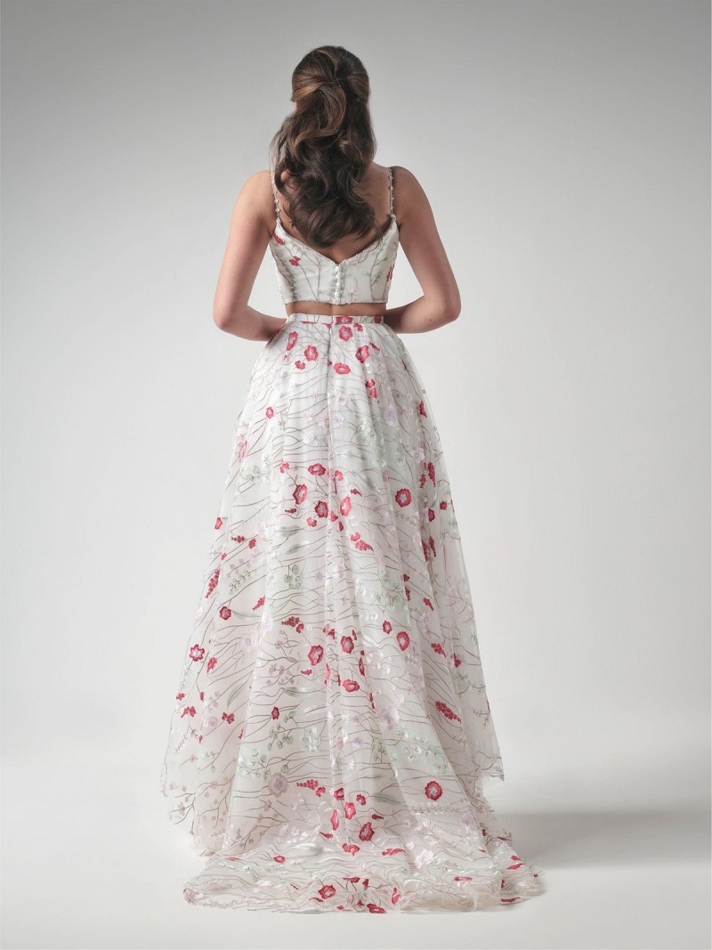 Falda de novia de suave tul color marfil con adorno de vistosas flores bordadas l Línea Geena
