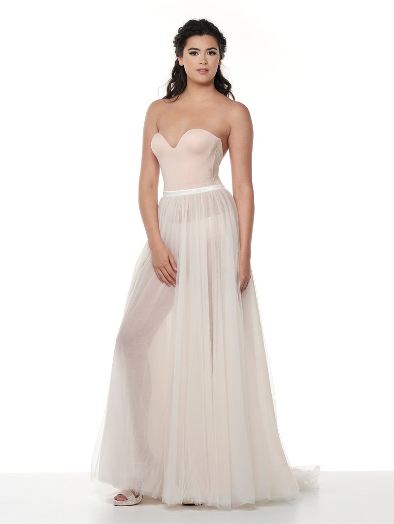 - Características: Suave tul de color marfil o una combinación de sobrefalda de color rubor y marfil, banda de cintura de satén mate