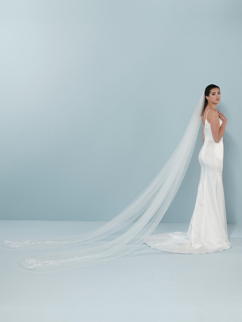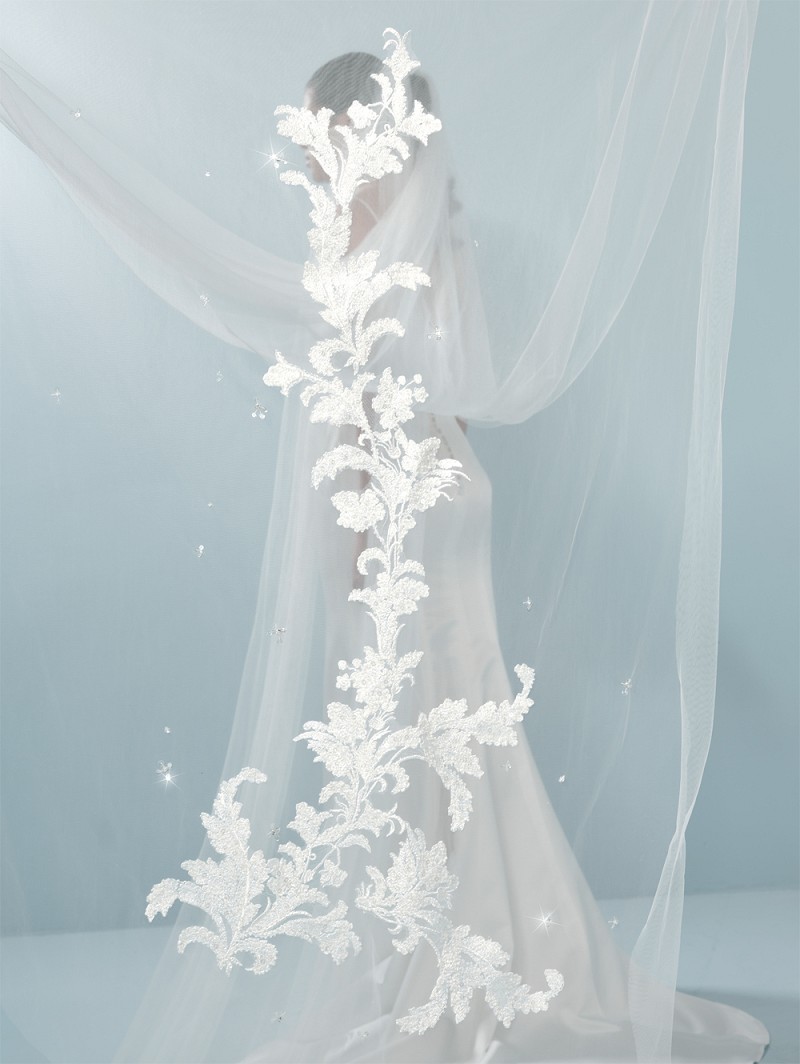 - Cuando esté al tanto de lo que está sucediendo en la moda de la boda, le encantará este velo de tul suave de color marfil de una sola capa de Poirier. Este velo tiene 2 rayas, pero 1 peine. Este velo está adornado con aplicaciones Paisley bordadas de lujo, pero también con cristales y lentejuelas. La longitud de este velo es de 350 cm (137,7 pulgadas) y se puede unir a tu cabello con un peine.