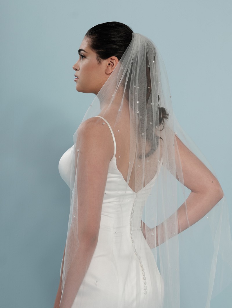 - Velo de tul suave de una capa de color marfil que está completamente adornado con cristales y pedrería