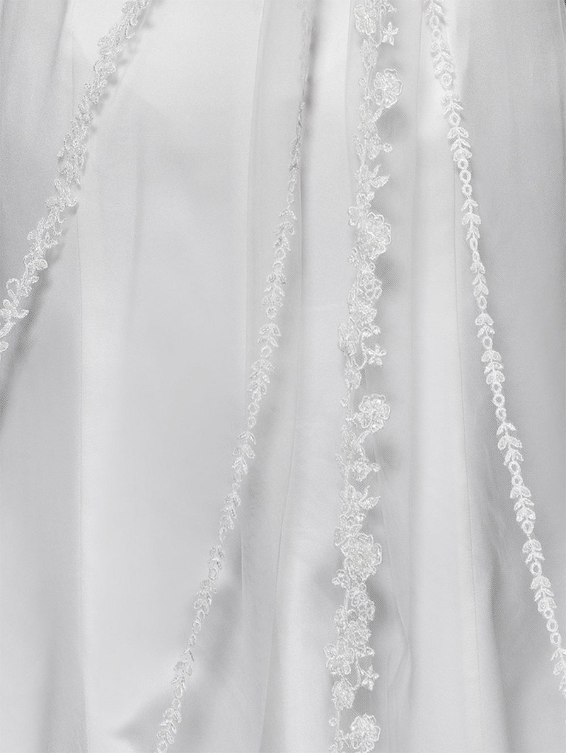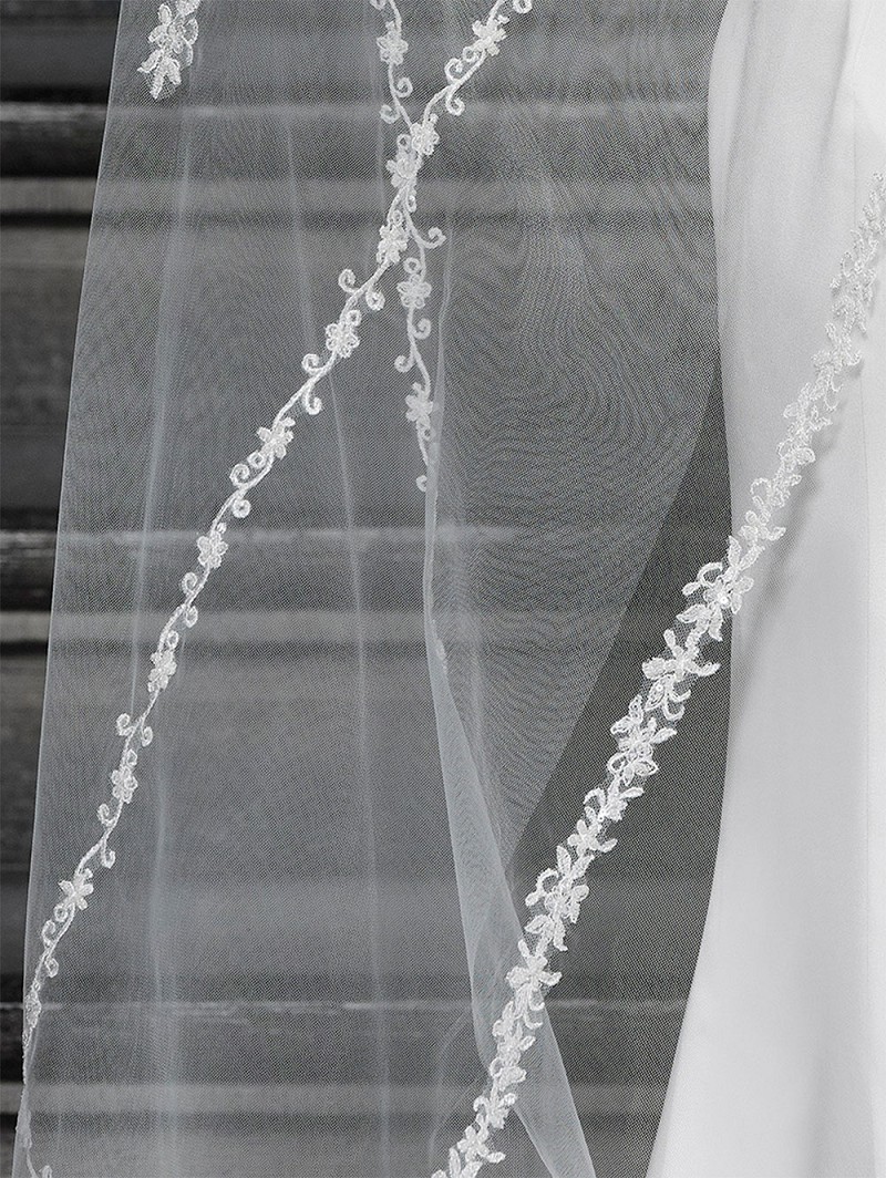 Velo de una capa de tul medio con motivos de flores, decorado con lentejuelas y abalorios, en rayas sobre el velo. Longitud 280 cm.