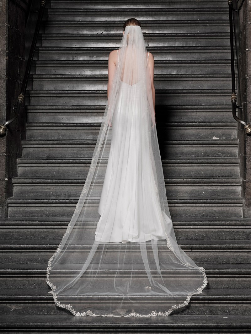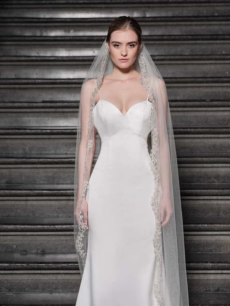 Velo de una capa de tul suave decorado con un motivo de flores dorado bordado con lentejuelas. Longitud 280 cm.