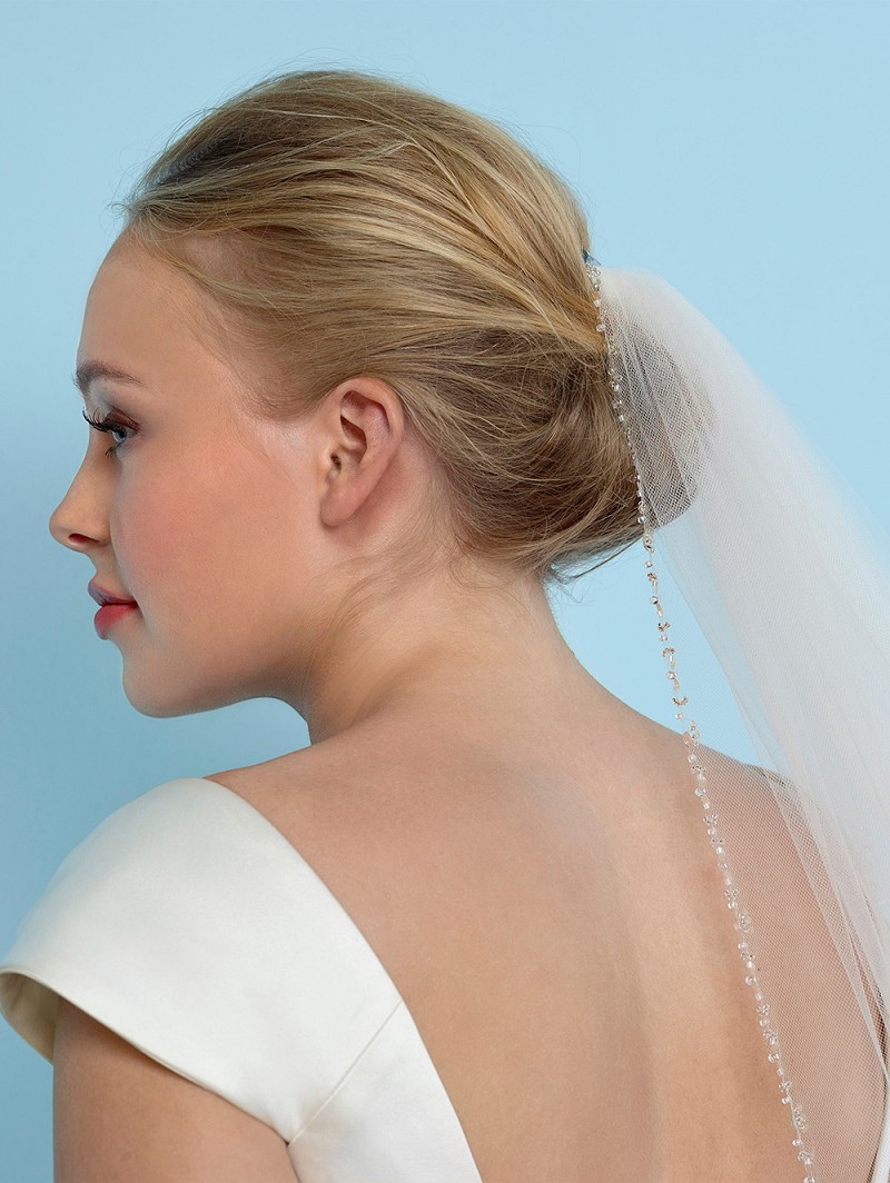 Velo de una capa. Un borde decorado con piedrecitas, perlitas y strass. Longitud 300 cm.También disponible en otras longitudes.