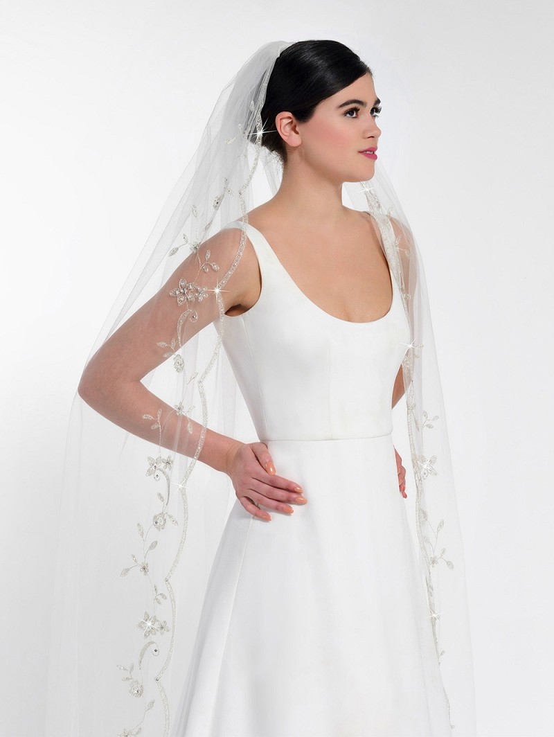 Velo de una capa de tul medio decorado con un motivos florales y foliares bordadas, perlas, cuentas, y piedras de strass. Longitud 300 cm.