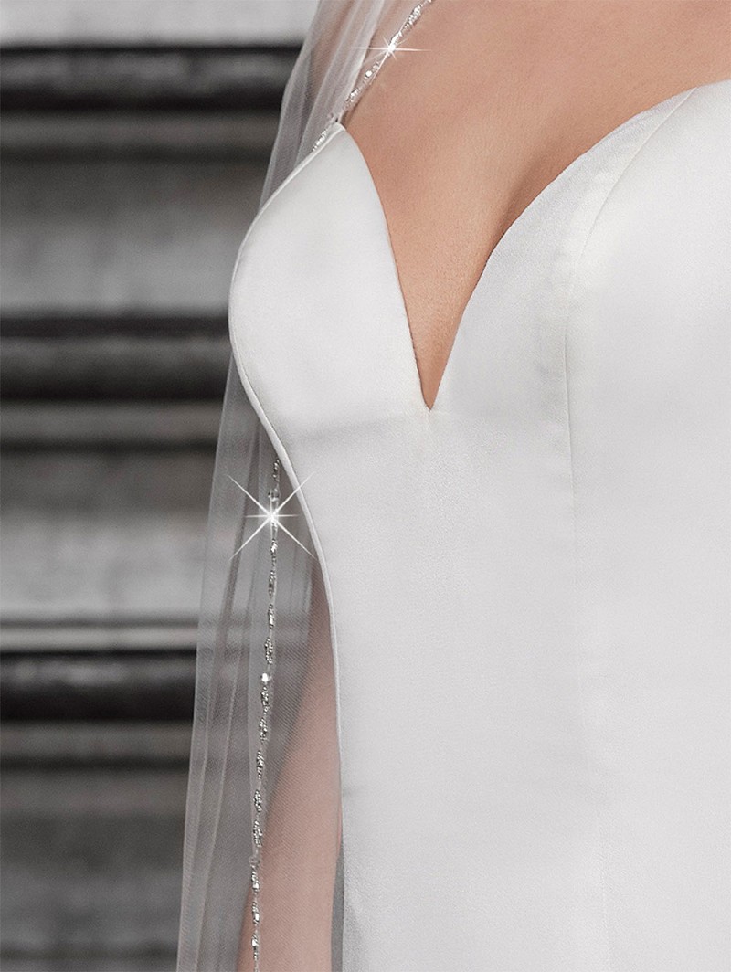 Velo de una capa de tul medio decorado con cristales. Disponible en 3 colores; Tul de marfil con cristales de plata, tul de champagne con cristales de rosa y tul de marfil con cristales de rosa. Longitud 300 cm.