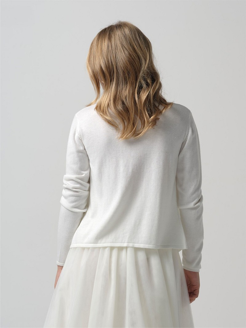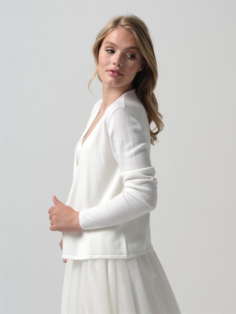 - Cuando busques un cárdigan básico para llevarlo cuando bajen las temperaturas durante tu fiesta de boda nocturna, asegúrate de consultar el cárdigan S190 de la Colección Essentials de Poirier. Este cárdigan puede combinarse con todo tipo de modelos y estilos, y tiene un aspecto y un tacto japonés moderno. Este cárdigan está disponible en el color marfil y en las tallas S a L. Además, el cárdigan está hecho en un 80% de tejido acrílico y un 20% de algodón.