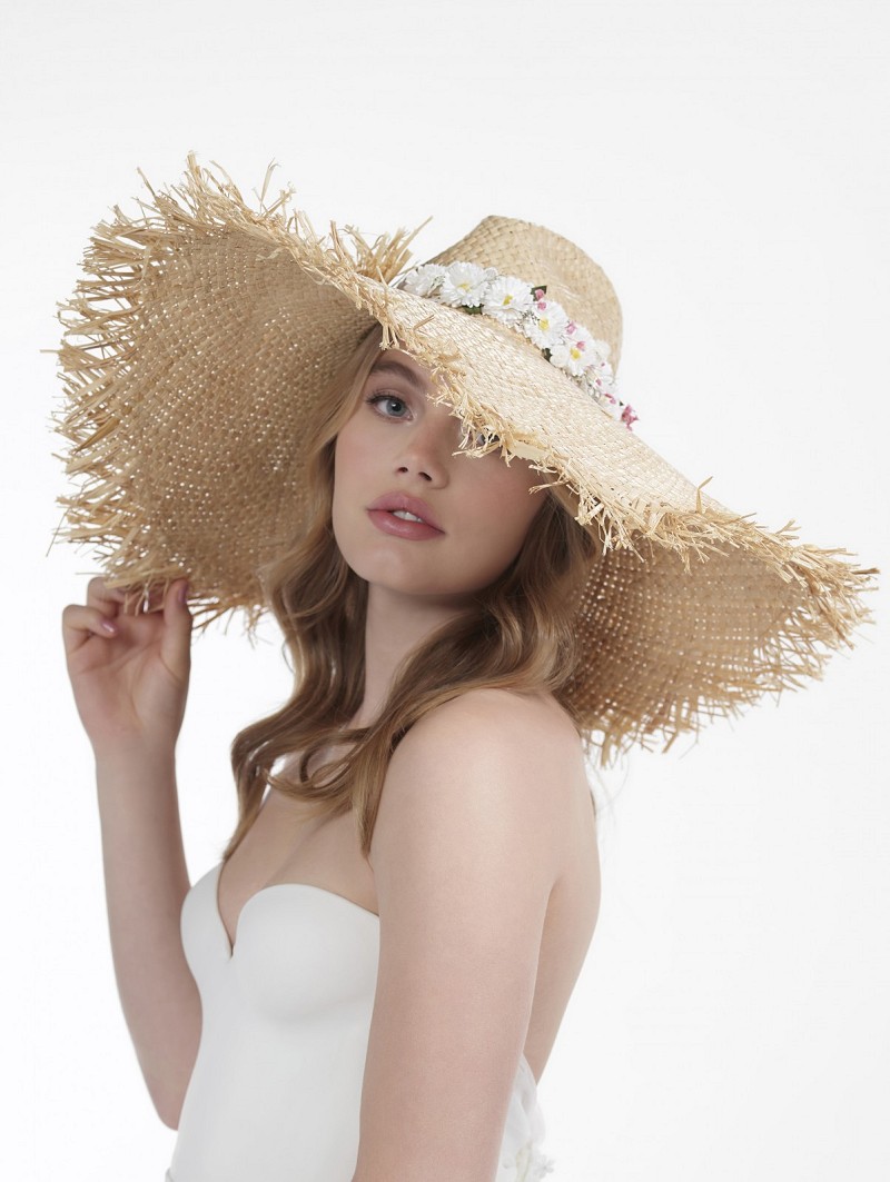 - Lorsque vous êtes à la recherche d’un chapeau qui transmet ce genre libre de sentiment festival, jetez un oeil au chapeau HT-106. Ce chapeau s’appelle « Eté ». Ce chapeau est fait de raphia tressé, et est de couleur naturelle. Ce chapeau a également une large bande douce. A côté de cela, le chapeau est décoré d’une bande de dentelle ivoire, et d’une guirlande avec de vraies marguerites. Style de ce chapeau comme vous le souhaitez pour votre jour de mariage, et l’air absolument incroyable. Vous pouvez combiner ce chapeau avec différents types d’accessoires par Poirier.
