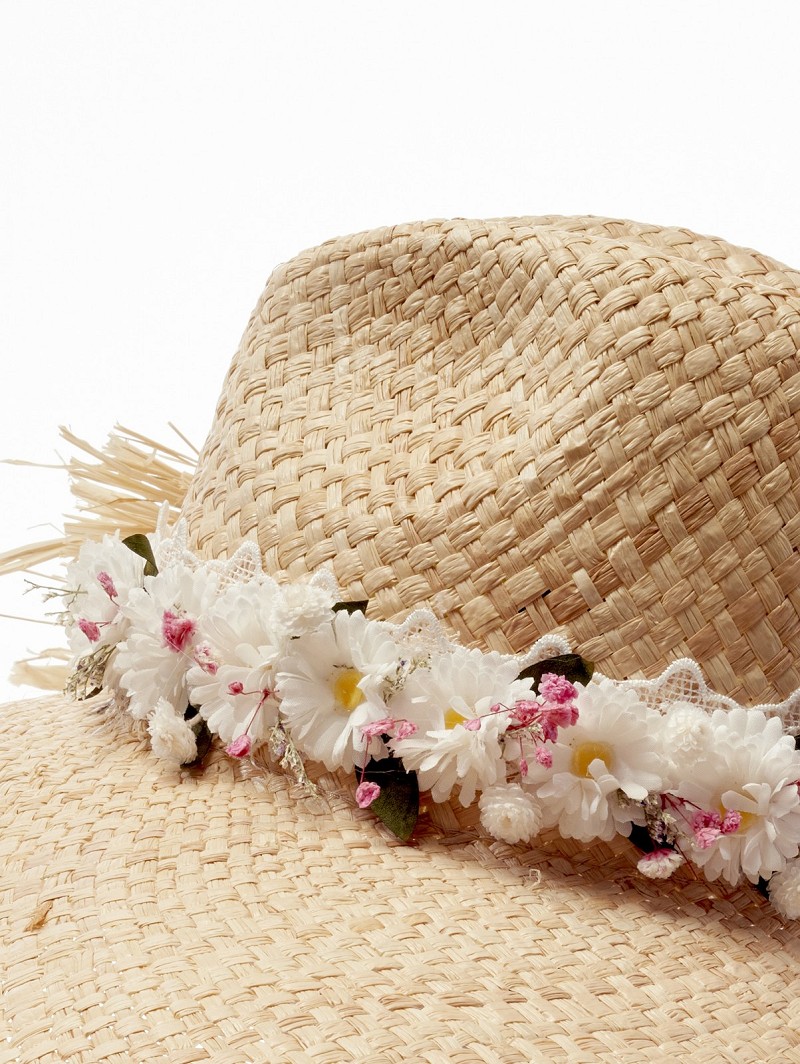 Chapeau Raffia avec bande de dentelle et guirlande avec de vraies marguerites | L’été