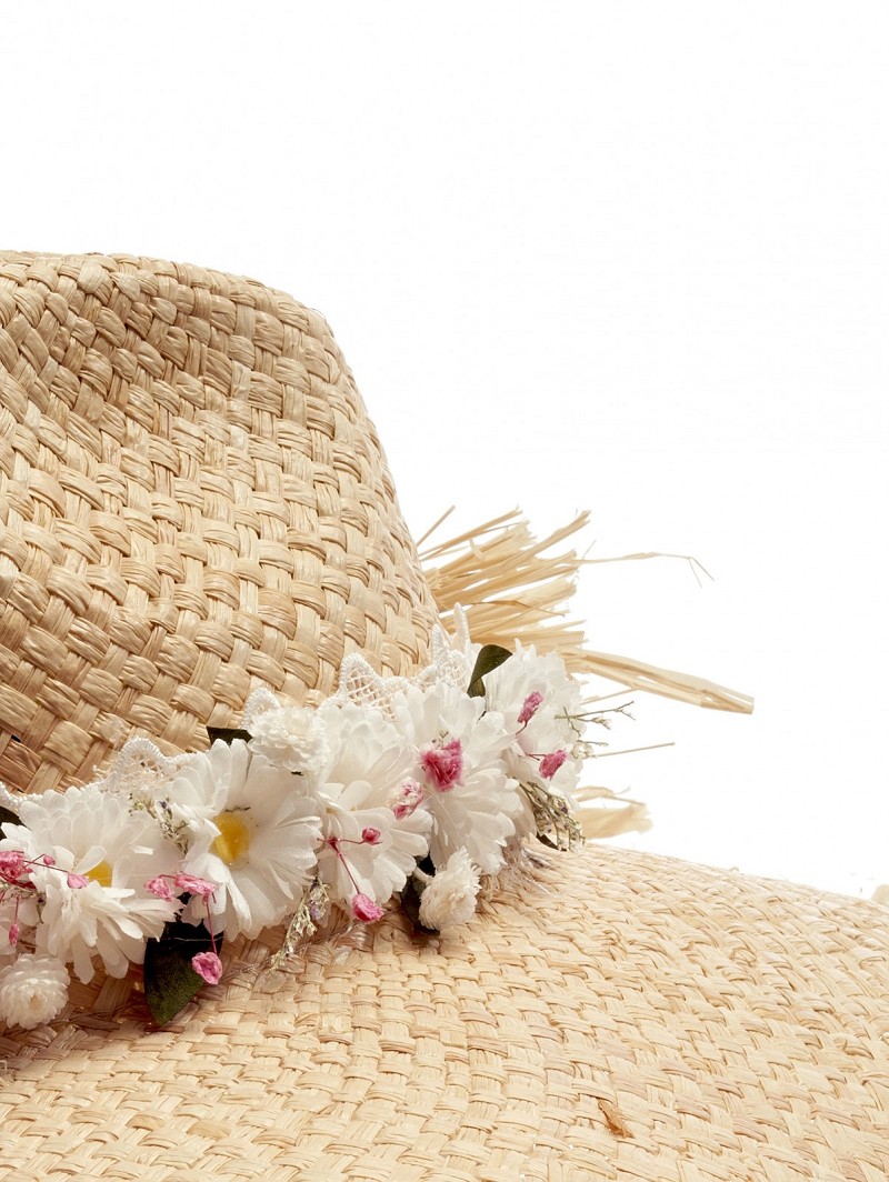 - Produit: HT-106 – Chapeau Raffia avec bande de dentelle et guirlande avec de vraies marguerites | L’été