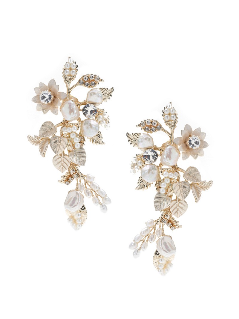 - Boucles d’oreilles faites de feuilles de couleur or ou argent, perles d’eau douce ivoire, fleurs de couleur or ou argent et strass