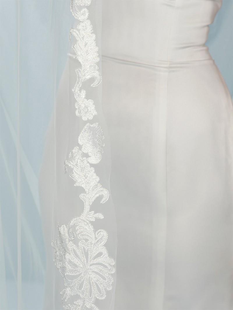 - Signes : Voile ivoire simple couche en tulle souple, dentelle