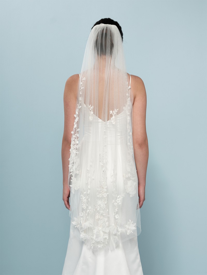 - Au cas où vous voudriez vous plonger dans une pure romance pendant votre grande journée, vous avez besoin de ce luxueux grand voile avec beaucoup de décorations. Ce voile en tulle doux ivoire simple couche a de luxueuses décorations en relief, des broderies ivoire et champagne, des fleurs décorées de paillettes, de cristaux mais aussi des fleurs en organza. La longueur totale de ce voile est de 120 cm (47.2 pouces) et il peut être attaché dans vos cheveux en utilisant son peigne.