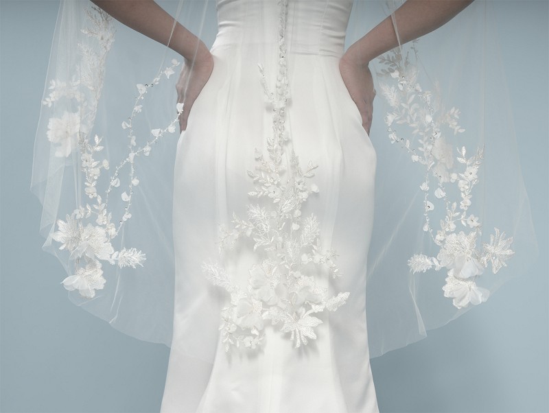 - Signes : Voile en tulle doux ivoire simple couche, luxueuses ornementations de fleurs en relief, broderies de couleur ivoire et champagne, paillettes, cristaux, organza
