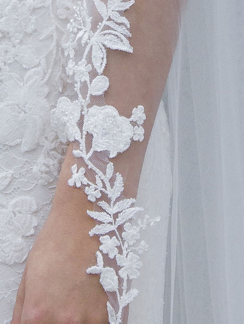 - Produit : S701-120/1/Soft – Voile nuptial à couche unique avec motif de fleur de dentelle brodée, perles et paillettes