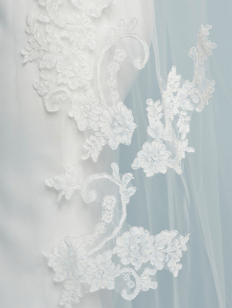 - Signes : Voile simple couche en tulle moyen, dentelle française