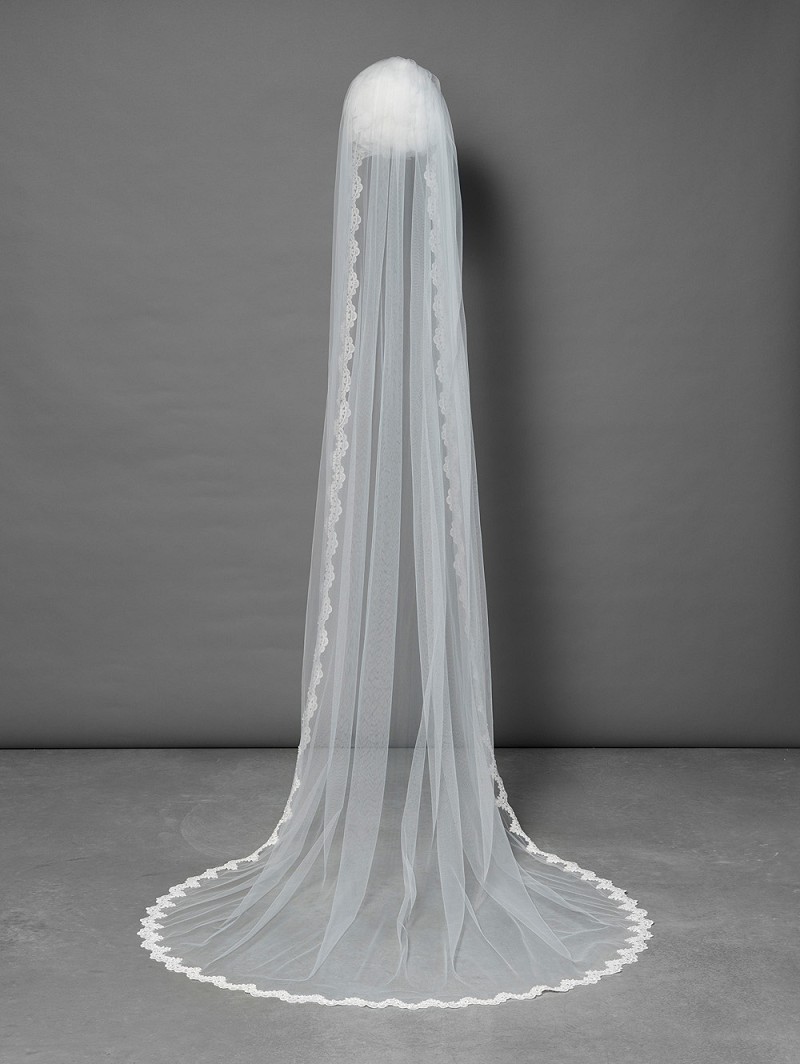 Voile en une couche de tulle souple, avec bord festonné en dentelle orné de perles et paillettes. Longueur 280 cm.Aussi livrable en autres longueurs.