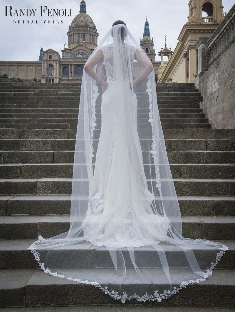 - Lorsque vous êtes à la recherche d’un voile nuptial décoré, assurez-vous de jeter un oeil au voile S701-300/1/Soft de la collection Randy Fenoli Veil de Poirier. Ce voile à couche unique est fait de tulle doux de couleur ivoire et mesure 300 cm (118,1 pouces) de long. Le voile a une décoration de dentelle brodée de couleur ivoire avec des perles et des paillettes. La dentelle de ce voile commence à la longueur du coude. Vous pouvez combiner ce voile avec différents types de robes de mariée.