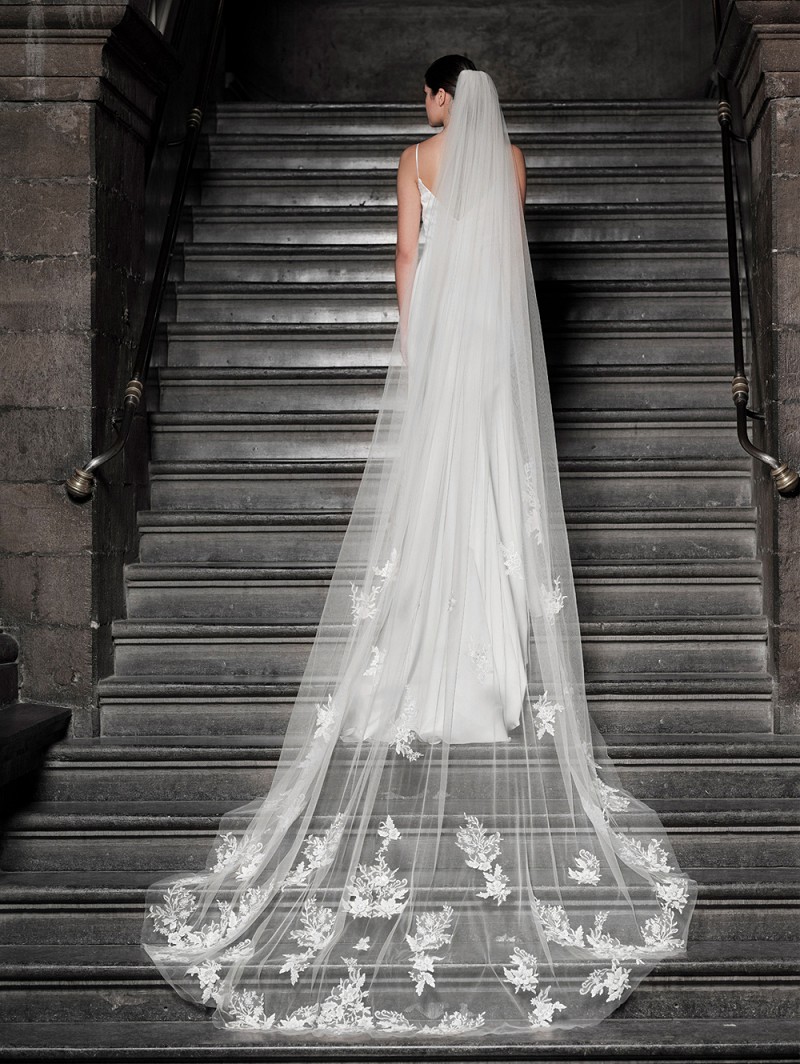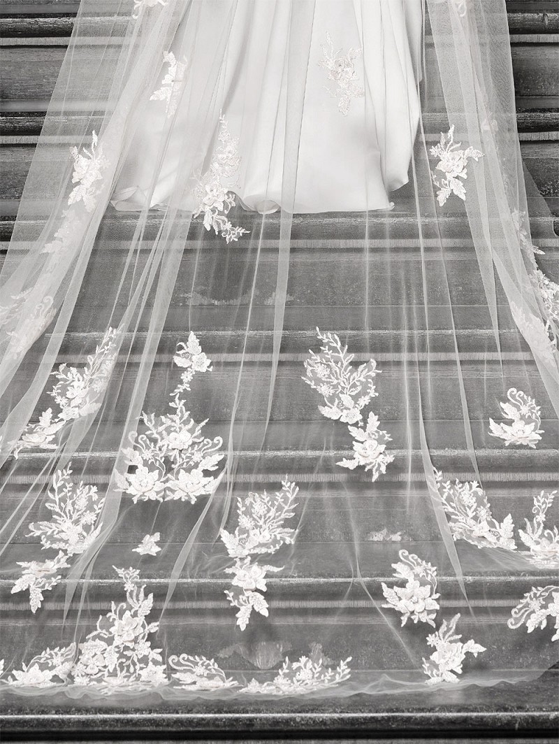 Voile à une couche en tulle moyen de couleur ivoire embelli de fleurs brodées de couleur ivoire, mais aussi de paillettes et de perles. La longueur de ce voile est de 350 cm (137.7 inch).