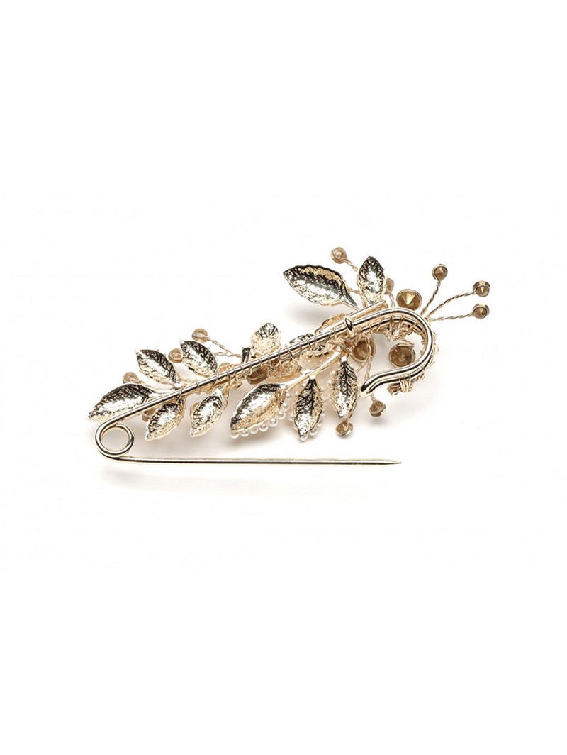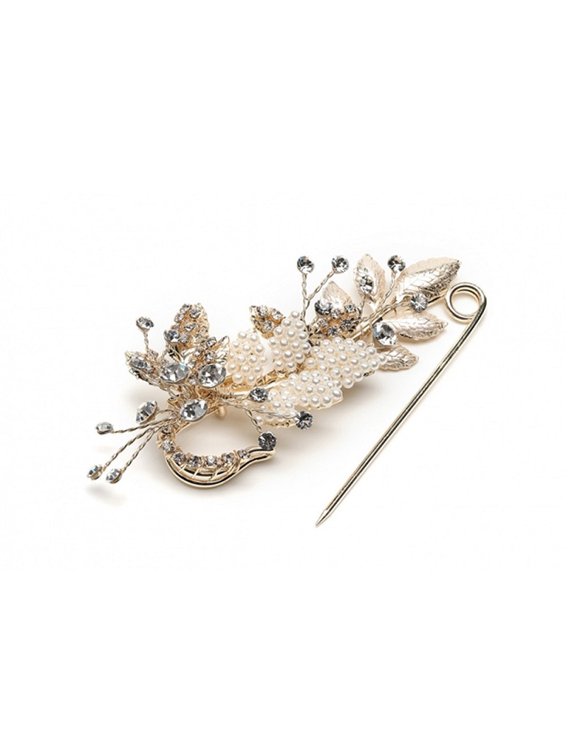Gold-coloured trainpin with rhinestones and pearls. An adornment that can be used to pin up the train during the party.