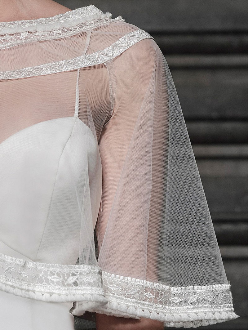 Luxurious cape with short sleeves in bohemian style, with several embroidered lace strips and tassels.