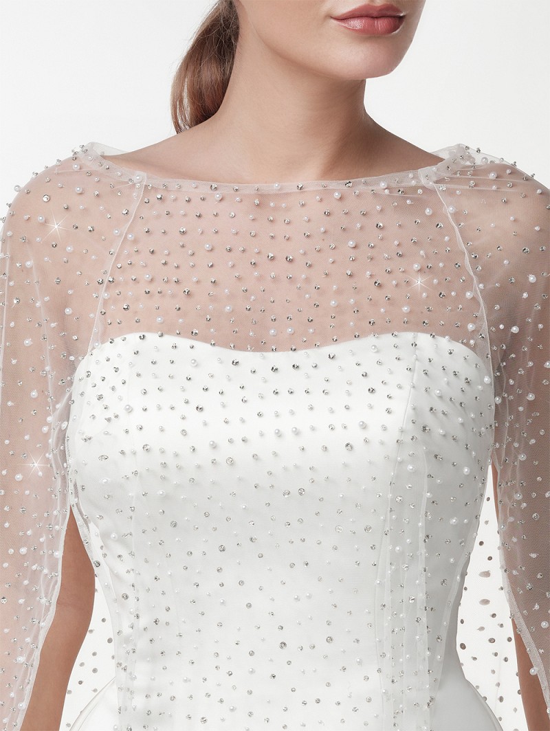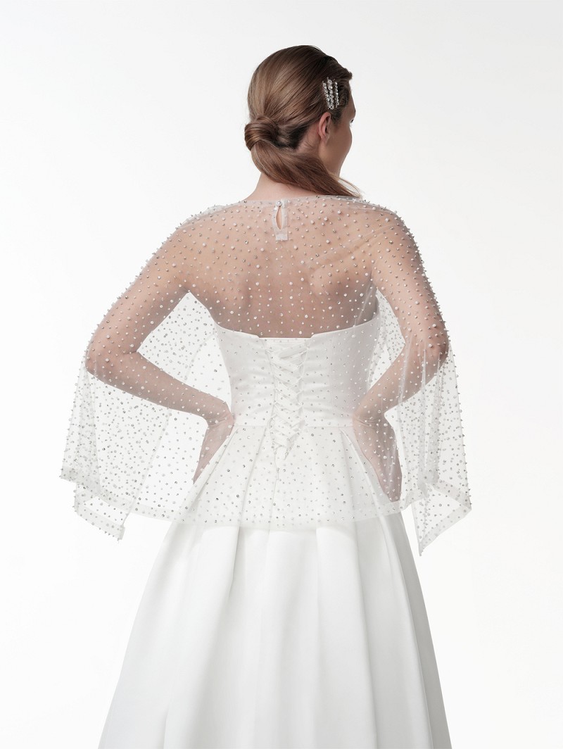 - Deluxe ivory-colored cape out of soft-tulle with pearls and rhinestones