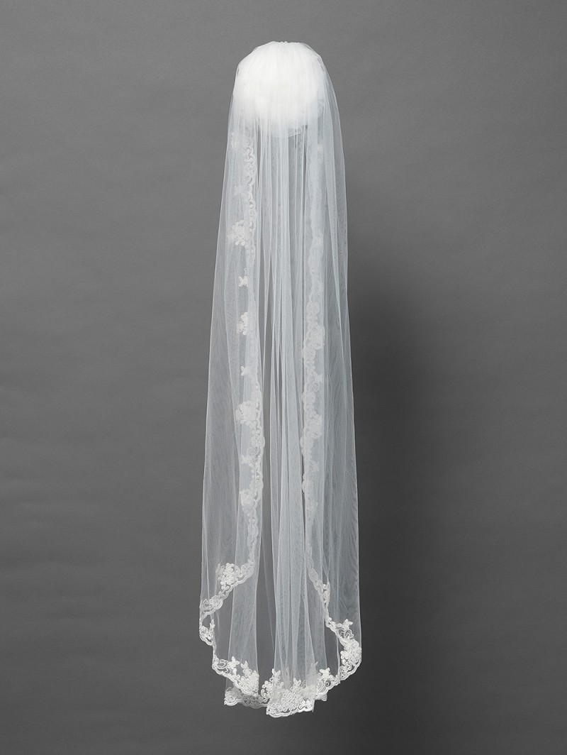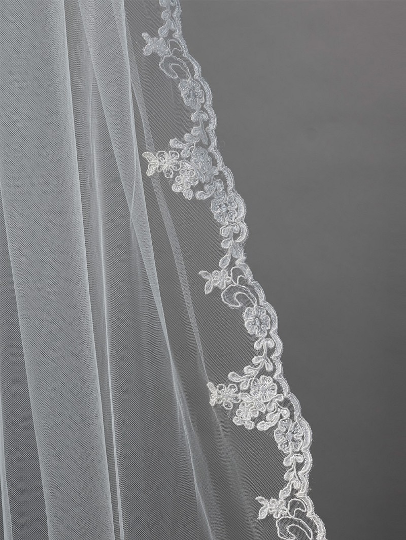 This veil consists of one layer of soft tulle and fine lace with floral design. Length 120 cm.Also available in other lengths.