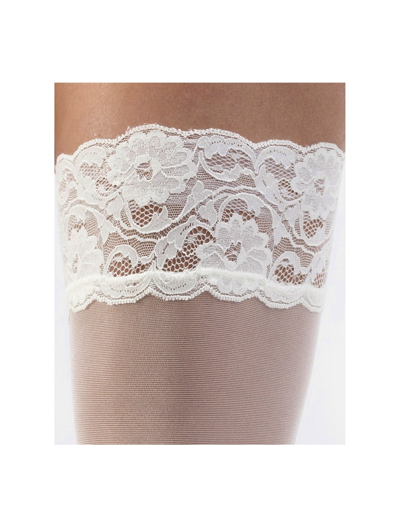 Éénkleurige (uni-colour) stay-up stocking afgewerkt met een smalle kanten band.
