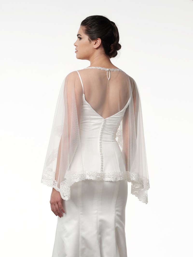 - Deze soft-tule cape kan je dragen om een volledige wedding look te creëren, maar je kan deze ook dragen wanneer het afkoelt tijdens bijvoorbeeld een outdoorfeest. Je kunt de cape vastmaken door het stoffen knoopje middenachter. Het materiaal waarvan deze cape is gemaakt is kant met pailletten aan de rand.