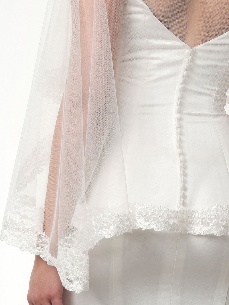 - Ivoorkleurige soft-tule cape met kant en pailletten