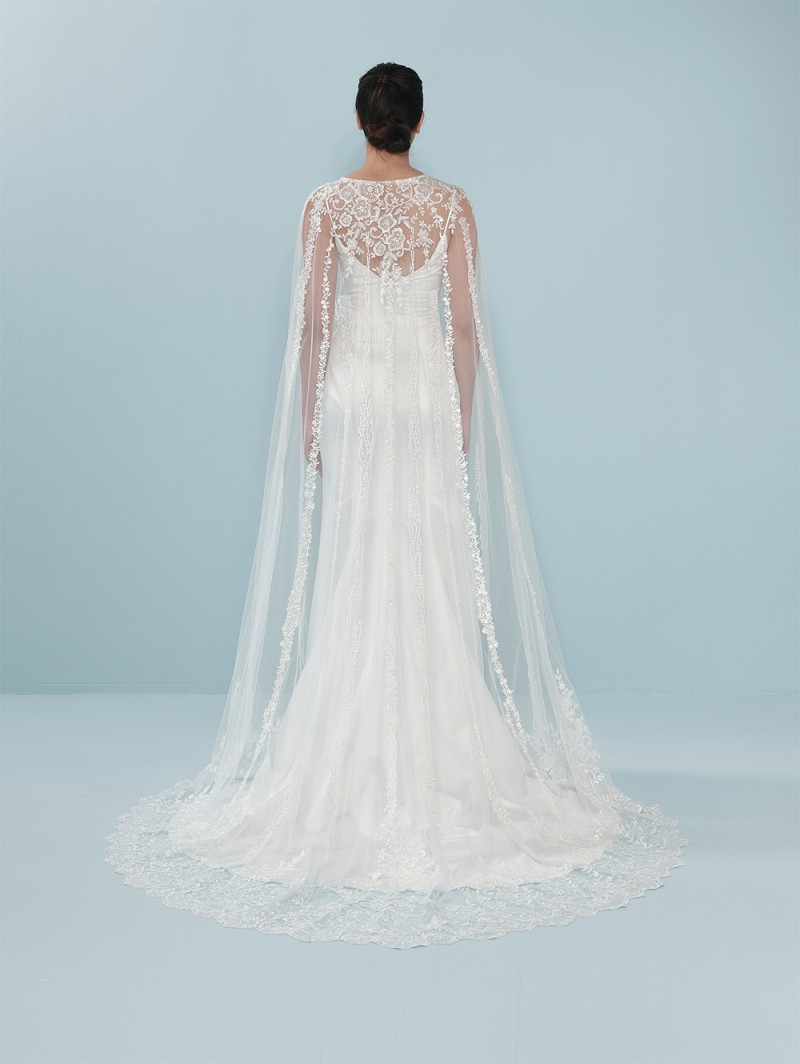 - Deze luxe ivoorkleurige cape van soft-tule met lange sleep draag je over je schouders om jouw wedding look die extra royal class te geven. De cape is prachtig te combineren met verschillende type romantische trouwjurken.