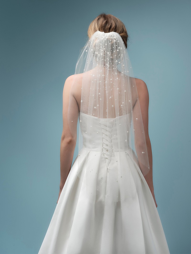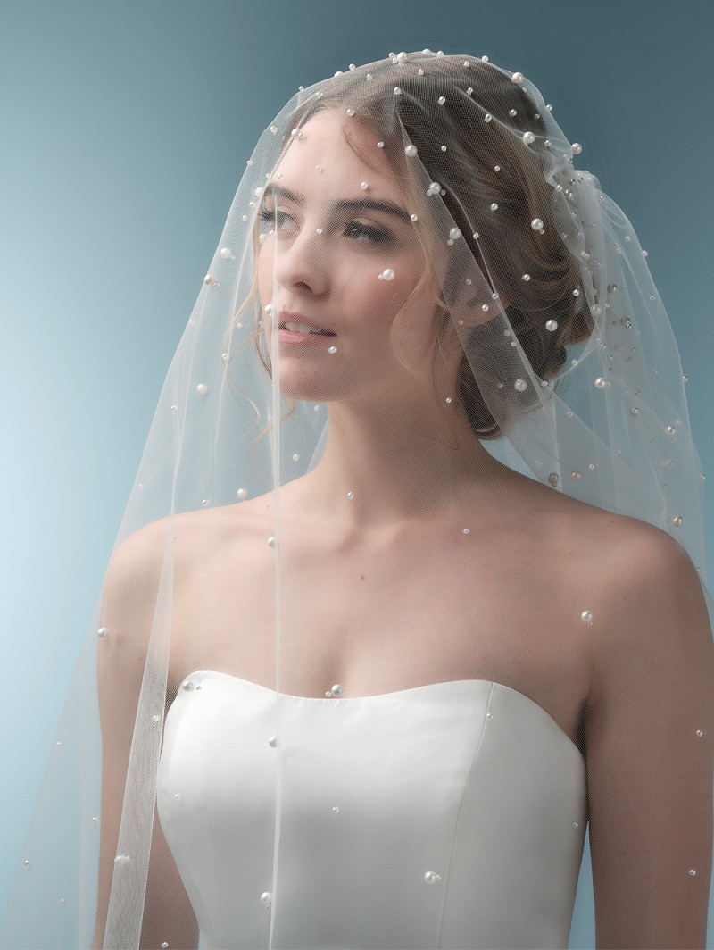 Sluier gemaakt van enkellaagse medium-sluiertule versierd met grote parels