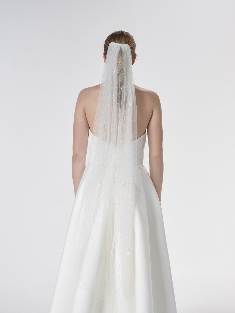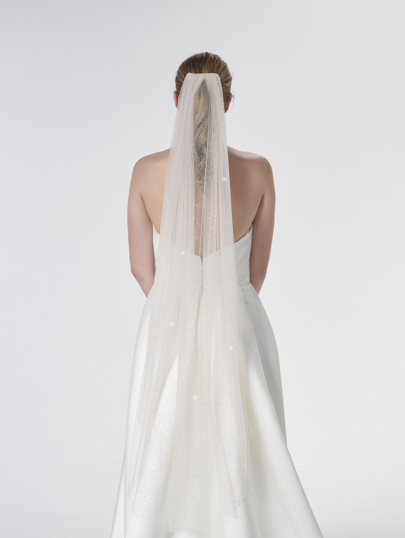 - Wanneer je zoekt naar een sluier die schittert als het licht de sluier raakt, kijk dan eens naar sluier S47-120/1/Soft uit de Essential Collection van Poirier. Deze sluier is gemaakt van enkellaagse soft-glittertule en is 120 cm lang. De sluier begint te glitteren wanneer het licht de sluier raakt, waardoor je bruidsoutfit een extra sparkle zal krijgen. De sluier is verkrijgbaar in meerdere kleuren: ivoor, blush, light green en light peach. De sluier is gemakkelijk vast te zetten in je bruidskapsel door middel van de haarkam die aan deze sluier vast zit. Combineer deze sluier met verschillende andere accessoires van Poirier.