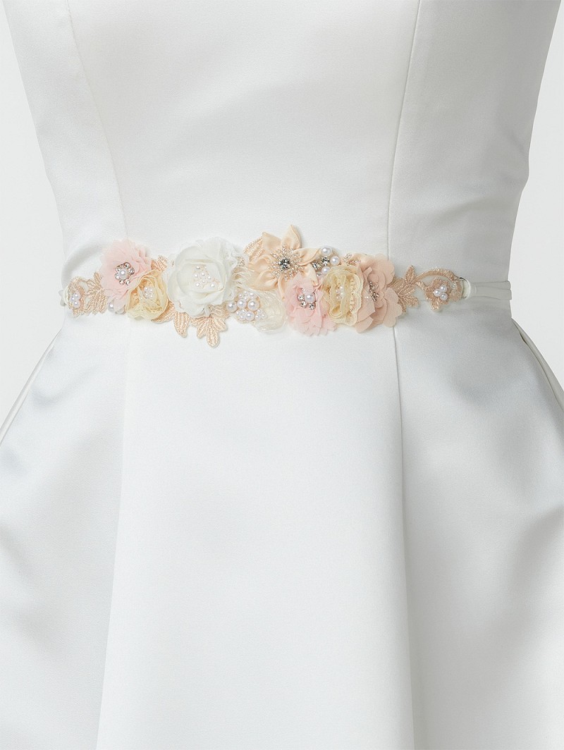 Ceintuur met bloemapplicatie, strass, parels en kraaltjes.