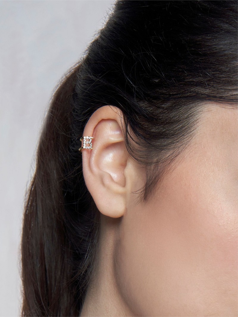 Geef je mooiste dag extra sparkle met cuff JE-102 uit de Fine Jewelry Collection van Poirier. Dit type oorbel wordt bovenaan het oor gedragen. Het design van deze oorbel heeft de “B” van Bride. Deze letter is bezaaid met zirkoniasteentjes. De oorbel is verkrijgbaar in goud en zilver en heeft een basis van 925 sterling zilver. Match deze oorbel met de sfeer van je bridal look.