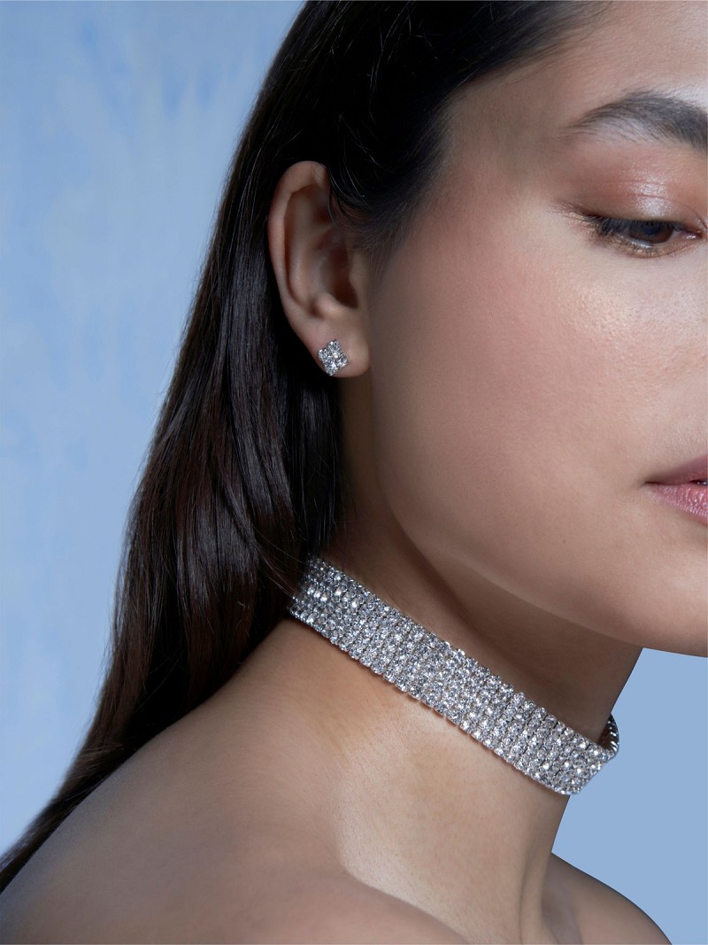 Kies voor een juwelenset die zowel fashionable als krachtig is en voor een moderne bridal look die een blijvende indruk zal achterlaten. De verschillende elementen van deze set zijn gemaakt van zilver en bezet met schitterende zirkonia. De halsketting uit deze set is een choker, hetgeen betekent dat deze dicht op de hals wordt gedragen. Deze bijzondere juwelenset van Poirier heeft twee paar oorbellen, waarvan één bestaat uit stekers met strasssteentjes en de ander een paar hangoorbellen is die eveneens strasssteentjes als versiering hebben. Deze set bestaat uit ware statement pieces. Zowel de armband als de halsketting zijn voorzien van een hangertje met het monogram van Poirier.