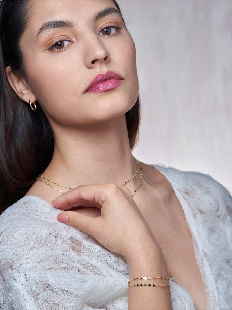 Kies voor een dubbele ketting en armband die beiden een subtiele elegantie uitstralen die wordt gecomplementeerd door de bijpassende oorbellen. Deze juwelenset is verkrijgbaar in een gouden en zilveren variant. De set is speciaal voor bruiden die willen schitteren door voor subtiele accessoires te kiezen. Zowel de armband als de halsketting van deze set hebben een hangertje met het monogram van Poirier voor een prachtige finishing-touch.