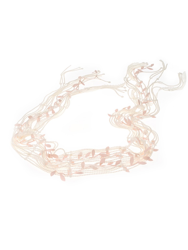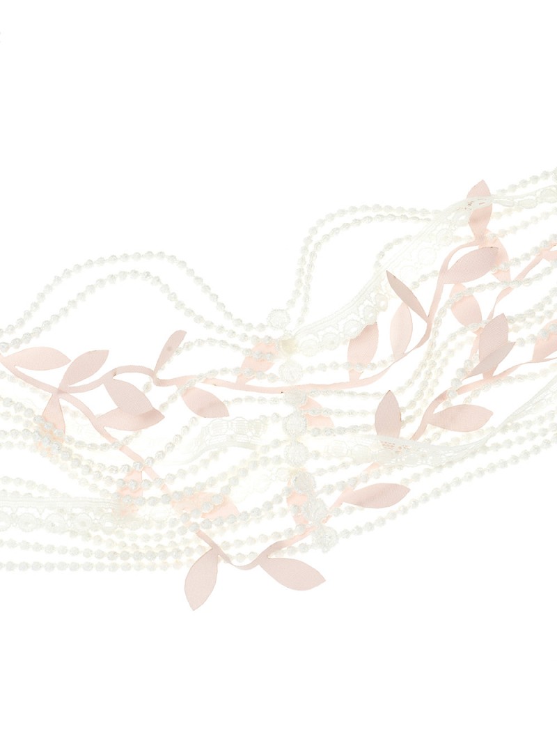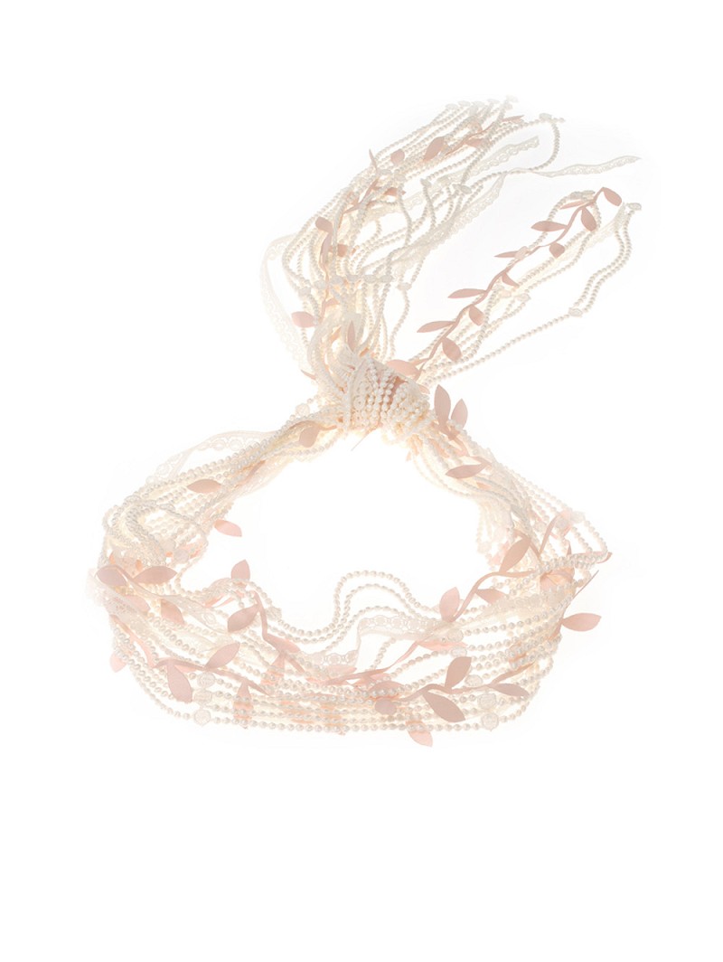 - Ivoorkleurige haarband versierd met blushkleurige stoffen blaadjesdecoratie en kant