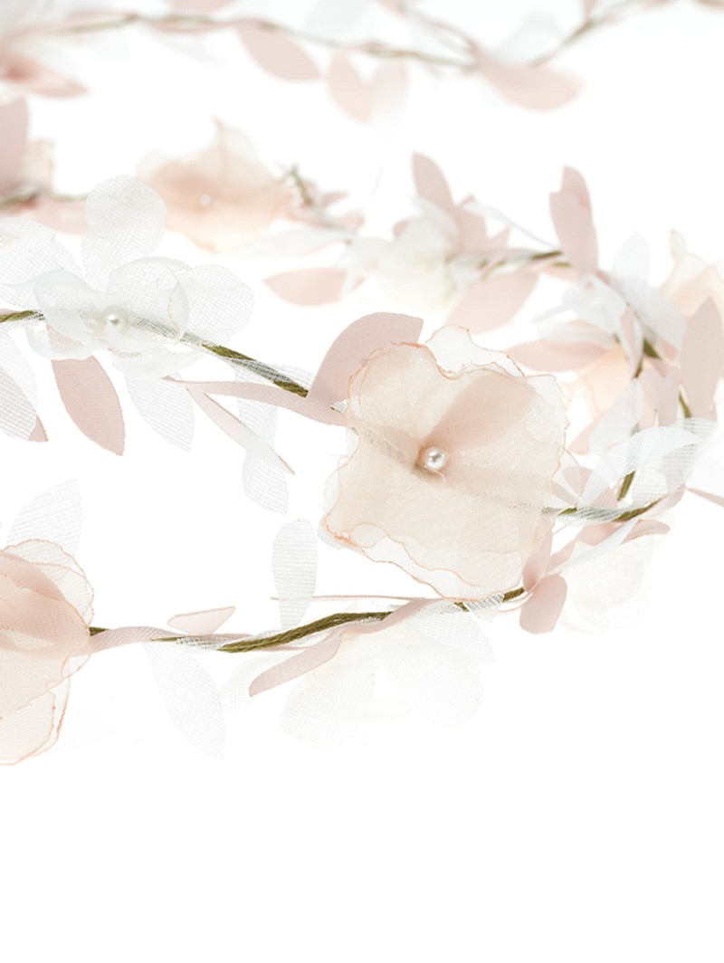 - Ivoorkleurige of blushkleurige flexibele organza haarband met een rij van organza bloemetjes en blaadjes