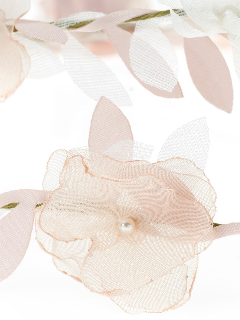 - Kenmerken: ivoorkleurige of blushkleurige haarband van flexibele organza, bloemetjes en blaadjes van organza, basis van ijzerdraad