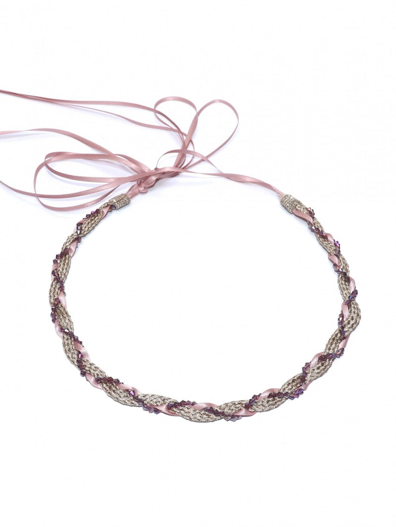 - Je kunt de festival-look verwerken in jouw trouwkleding door het dragen van deze roze- en goudkleurige gevlochten Bohemian haarband met bordeauxrode kristalletjes. Deze haarband is subtiel, maar geeft ook kleur aan jouw festival wedding-look door zijn mix van roze, goudkleur en bordeaux. De sluiting van deze haarband is middels een organza lint. Deze haarband past bij verschillende typen trouwkapsels. Voel je vrij met de Festival Collection van Poirier tijdens jouw mooiste dag.