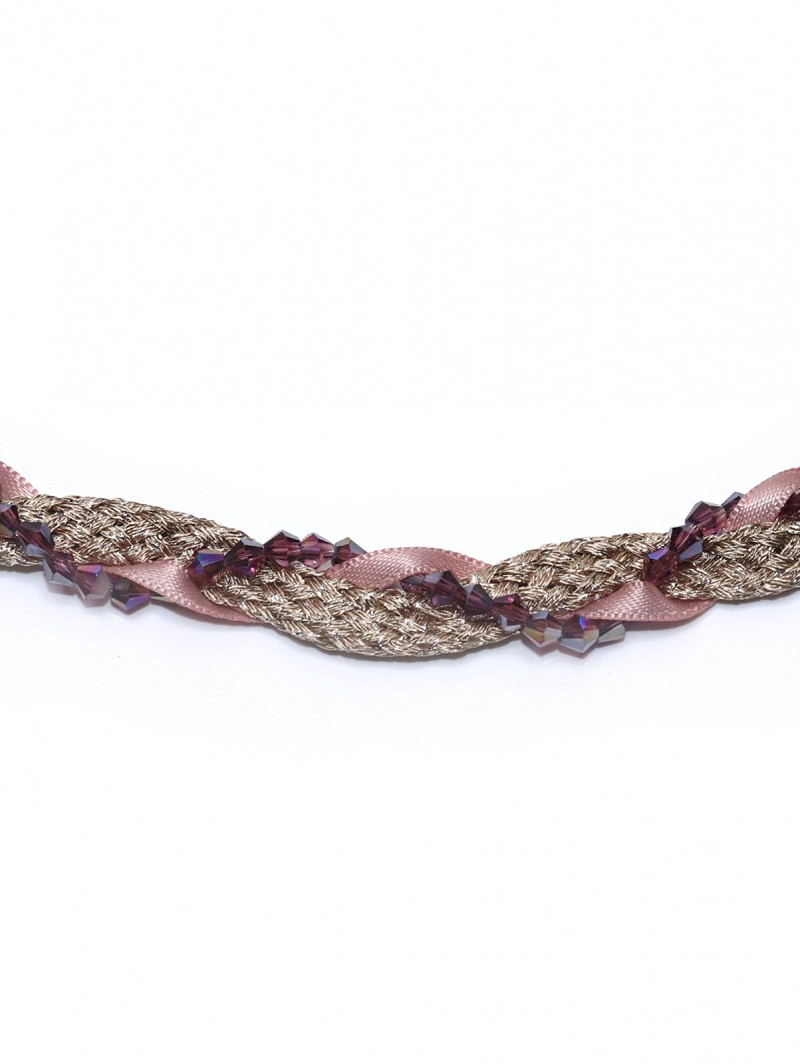 - Kenmerken: roze- en goudkleurige gevlochten haarband, bordeauxrode kristalletjes