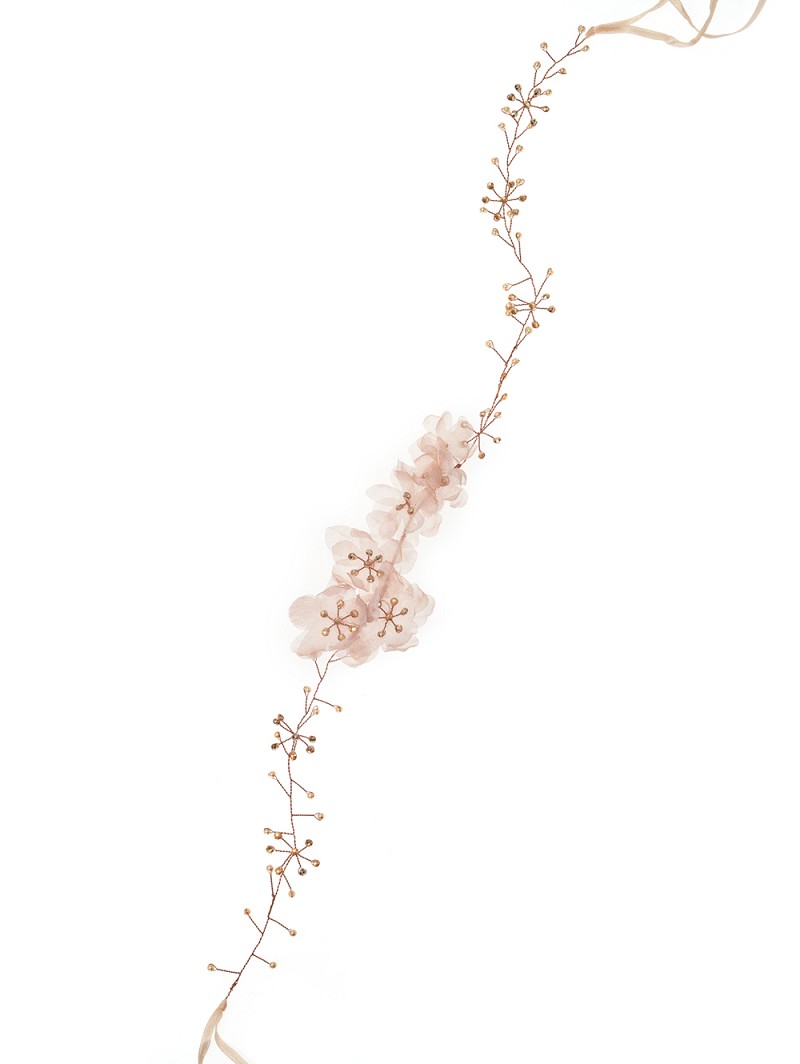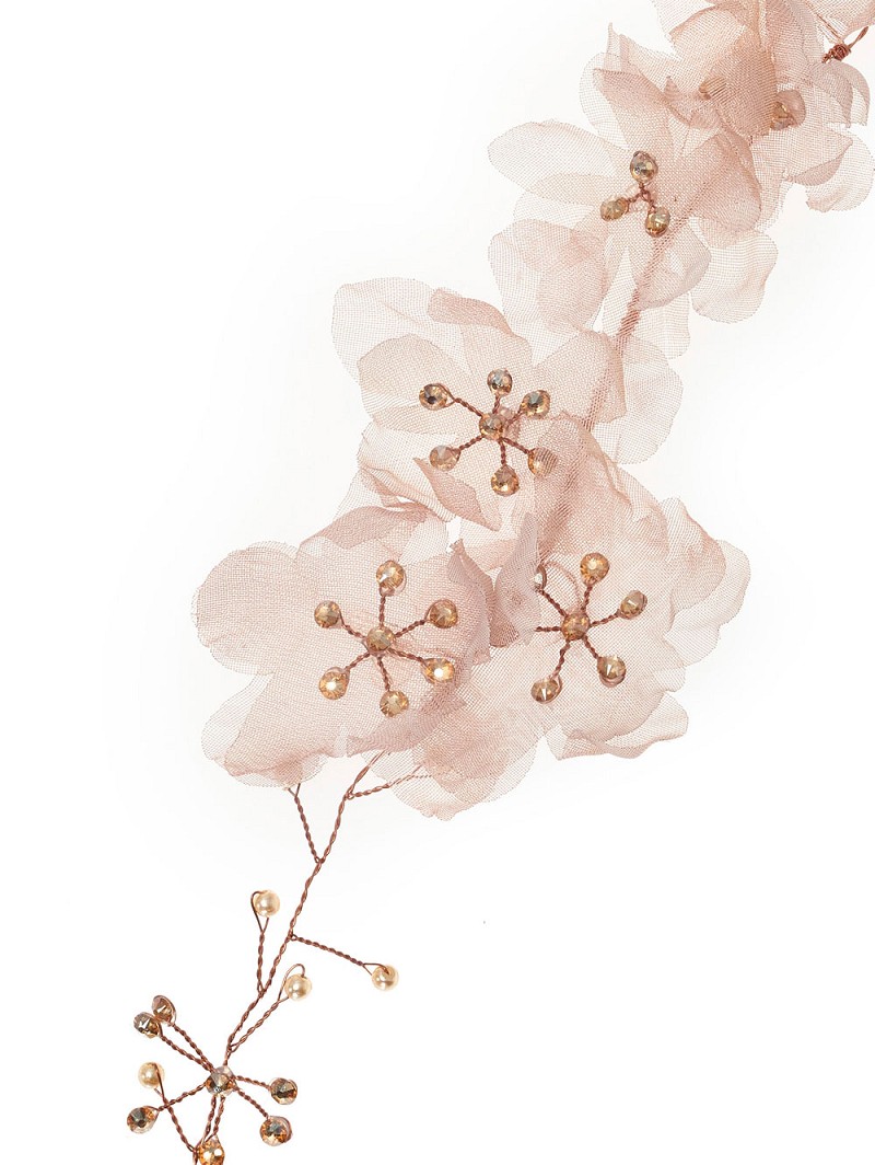 - Haarband met een basis van goudkleurige draad, champagnekleurige bloemen van organza, strasssteentjes en champagnekleurige pareltjes of haarband met een basis van goudkleurige draad, rosékleurige bloemen van organza, strasssteentjes en champagnekleurige pareltjes
