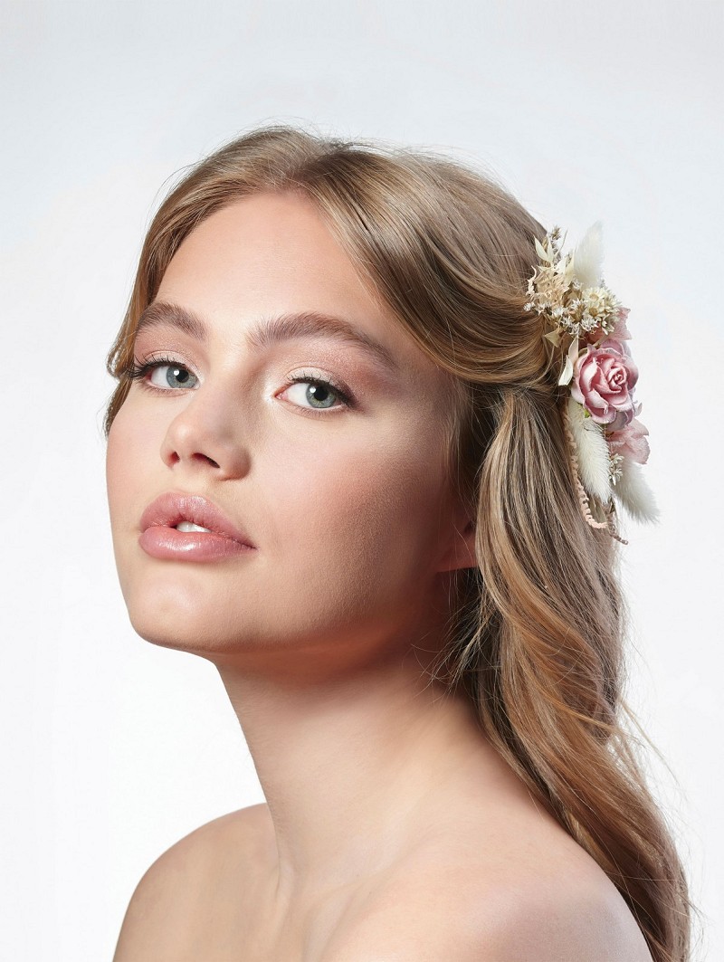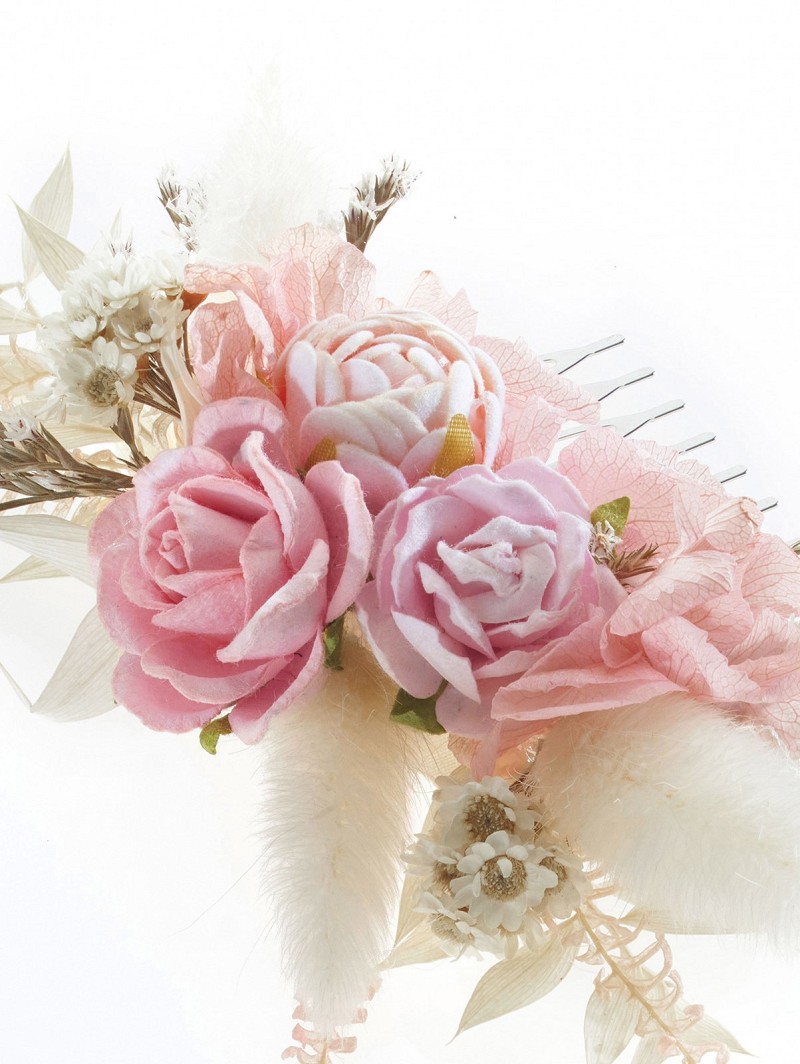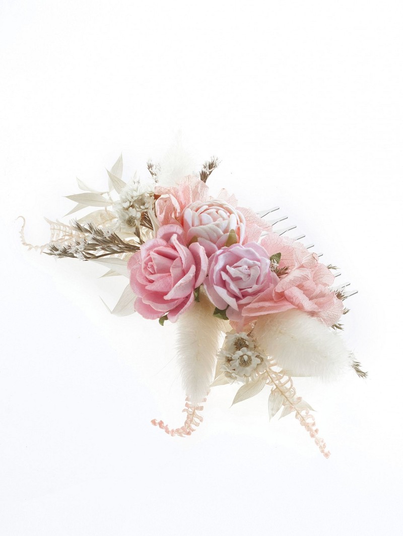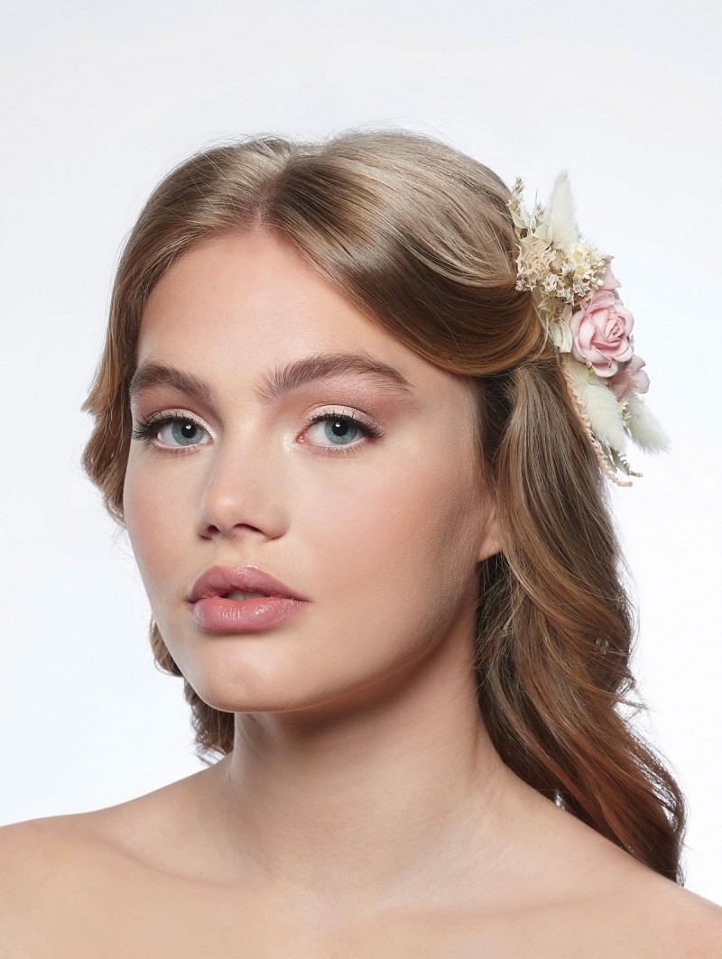 - Wanneer je kiest voor een fleurig haarsieraad, kies dan voor haaraccessoire BB-469 uit de Festival Collection van Poirier. Dit haarsieraad bestaat uit een zilverkleurige haarkam met daarop een combinatie van verschillende droogbloemetjes in de kleuren ivoor en verschillende rosétinten. Combineer dit haarsieraad met verschillende typen bridal hairstyles en laat een blijvende indruk achter.