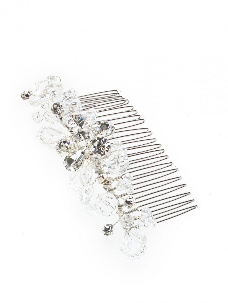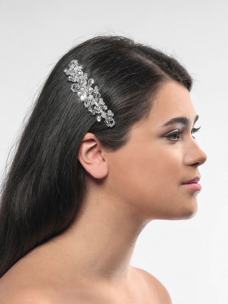 - Wanneer je graag een haaraccessoire wil dat prachtig schittert, kies dan voor item BB-1581. Deze zilverkleurige haarkam met een versiering van kristalletjes en strasssteentjes is gemakkelijk in je haar te bevestigen. Wanneer er licht valt op dit haaraccessoire zal dit gaan schitteren door de combinatie van kristalletjes en strasssteentjes. Geef je bruidskapsel een extra sparkle met dit bijzondere item van Poirier.